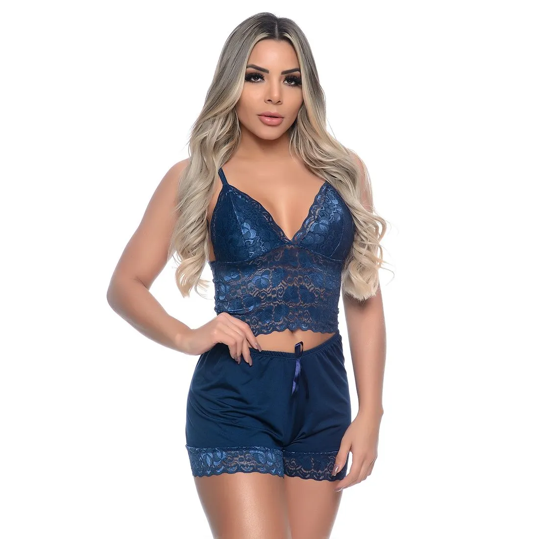 O top com forro nos seios e alças reguláveis proporciona ajuste perfeito ao corpo, enquanto a renda transparente adiciona charme e provocação na medida certa. O short com elástico na cintura e fita de cetim garante liberdade de movimentos, e o detalhe rendado na coxa é o toque final que desperta olhares e desejos.